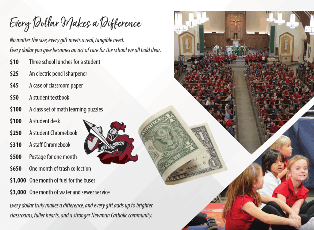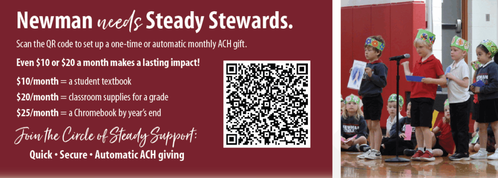 Your generosity strengthens every corner of our school. Each year, the Foundation helps bridge the gap between the $8,500 cost of tuition and the $11,000 true cost of a Newman Catholic education. Your gift directly supports next year’s school budget, keeping our classrooms vibrant, our teachers equipped, and our students surrounded by the love and guidance they need to flourish.